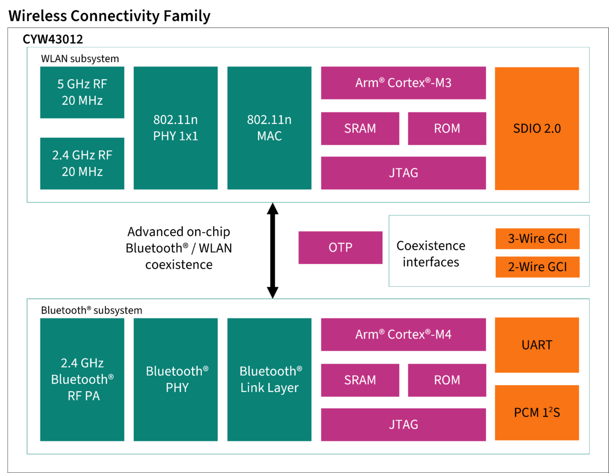 CYW43012 Wi-Fi + Bluetooth 芯片的内部框图如下图所示。